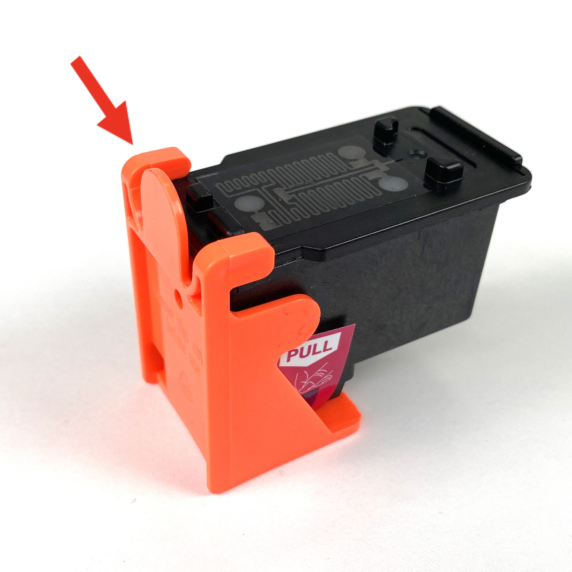 that protects the printhead and helps to preserve and maintain the quality of the cartridge. To remove this clip, please place the cartridge on a sturdy surface. Holding the clip with one hand, press down on the cartridge with the other hand and pull back on the clip. Some resistance is normal, so don't be alarmed. You may find some residual ink on the pad or some ink on the printhead of the cartridge. This is also normal, you can discard the removed protective cover. After removing the clip, you can install the cartridges in the printer as usual. If you need to print immediately and this troubleshooting did not resolve your ink cartridge problem, please select the option entitled "One Cartridge Printing".