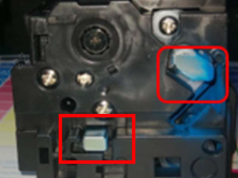 3. Locate the steel contact on the left side of the cartridge to make sure no toner power stained. If there is toner powder stained on the metal steel (pictured) wipe the stain with a tissue.