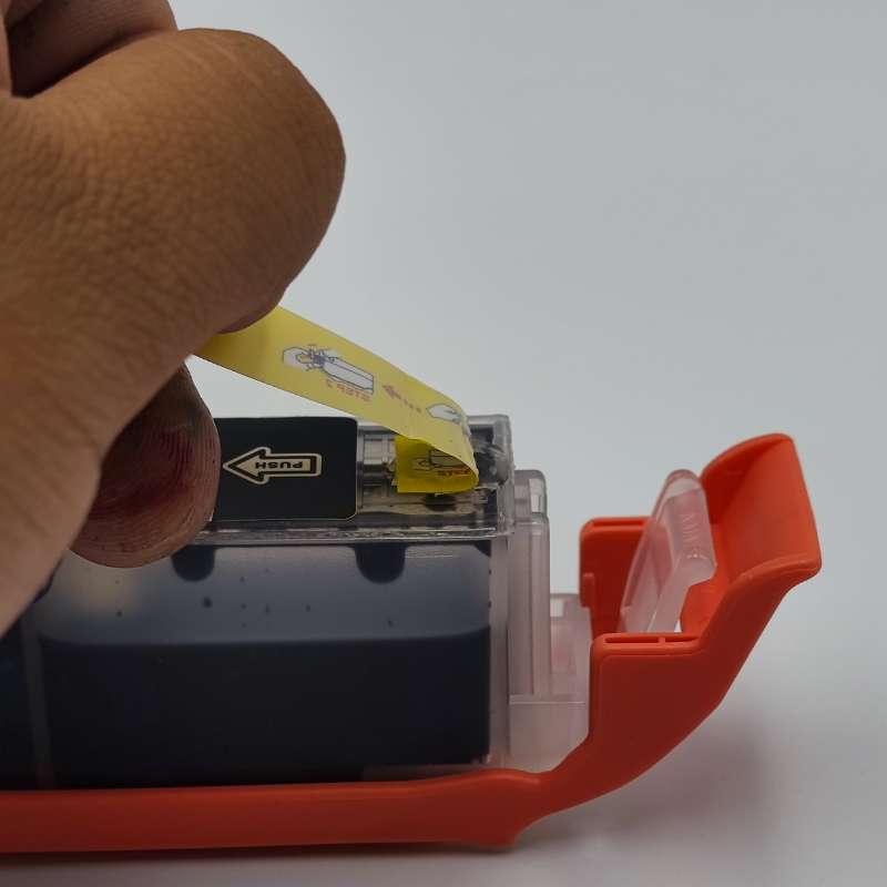 Make sure that the cartridge pictured matches the cartridge in your hand or installed in the printer (Figure 1). Verify that the printer you are using is listed in the printer compatibility table as a suitable printer for the cartridge you are trying to install. If One of these Two criteria do Not match, you have most likely received the incorrect ink cartridge for the printer. Please visit our Printer Compatibility page to assure the cartridge required for your printer. After confirming that your ink cartridge is correct for your printer, the first step is to remove the pull tab and clip from the cartridge. If it does not "click" into place, there is an easy solution to this problem.