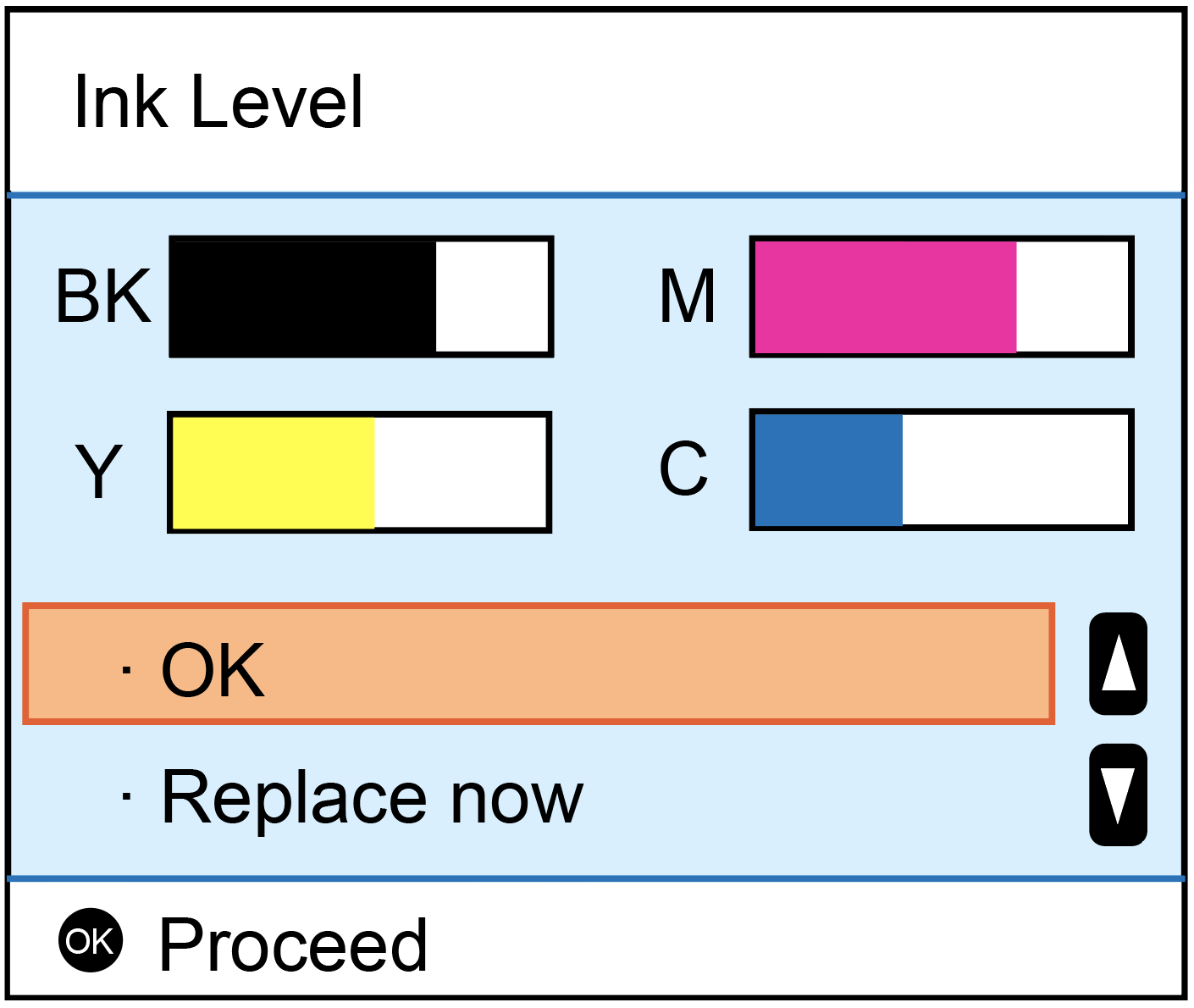 After replacing the ink cartridges, the ink cartridges will be recognized again and the exact ink levels will be displayed. (Figure 3) If you have just installed the ink cartridge and the ink levels display as low or empty, please remove the ink cartridge, take a lint free cloth to gently wipe the dust on the chip, and then replace the cartridge in the cradle. If the ink level is still low, it may be a problem with the chip. Plaese contact your dealer to replace the ink cartridge.