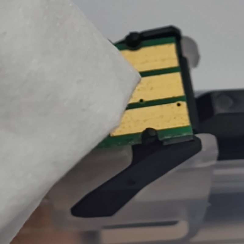 To clean the chip, you can use a pencil eraser. Brush the chip lightly with the eraser to remove any potential obstruction or debris. Or you can use any type of lint free cloth to gently wipe the chip (Figure 3), again to remove any type of obstruction or debris. Once this is complete, replace the ink cartridge in the cradle. If the problem persists, you need to reset the printer. This can be done by turning off the computer and the printer with the cartridge installed. Unplug your printer and let your machines off for 2 minutes. Restart the printer and computer, and try printing again. If you tried both steps and got the same error, there is most likely an electrical problem with the cartridge and you should return the cartridge to where you purchased it.