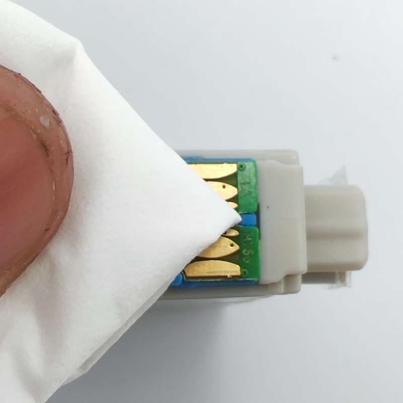 To clean the chip, you can use a pencil eraser. Brush the chip lightly with the eraser to remove any potential obstruction or debris. Or you can use any type of lint free cloth to gently wipe the chip (Figure 3), again to remove any type of obstruction or debris. Once this is complete, replace the ink cartridge in the cradle. If the problem persists, you need to reset the printer. This can be done by turning off the computer and the printer with the cartridge installed. Unplug your printer and let your machines off for 2 minutes. Restart the printer and computer, and try printing again. If you tried both steps and got the same error, there is most likely an electrical problem with the cartridge and you should return the cartridge to where you purchased it.