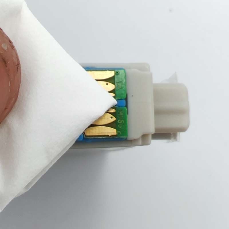 To clean the chip, you can use a pencil eraser. Brush the chip lightly with the eraser to remove any potential obstruction or debris. Or you can use any type of lint free cloth to gently wipe the chip (Figure 3), again to remove any type of obstruction or debris. Once this is complete, replace the ink cartridge in the cradle. If the problem persists, you need to reset the printer. This can be done by turning off the computer and the printer with the cartridge installed. Unplug your printer and let your machines off for 2 minutes. Restart the printer and computer, and try printing again. If you tried both steps and got the same error, there is most likely an electrical problem with the cartridge and you should return the cartridge to where you purchased it.