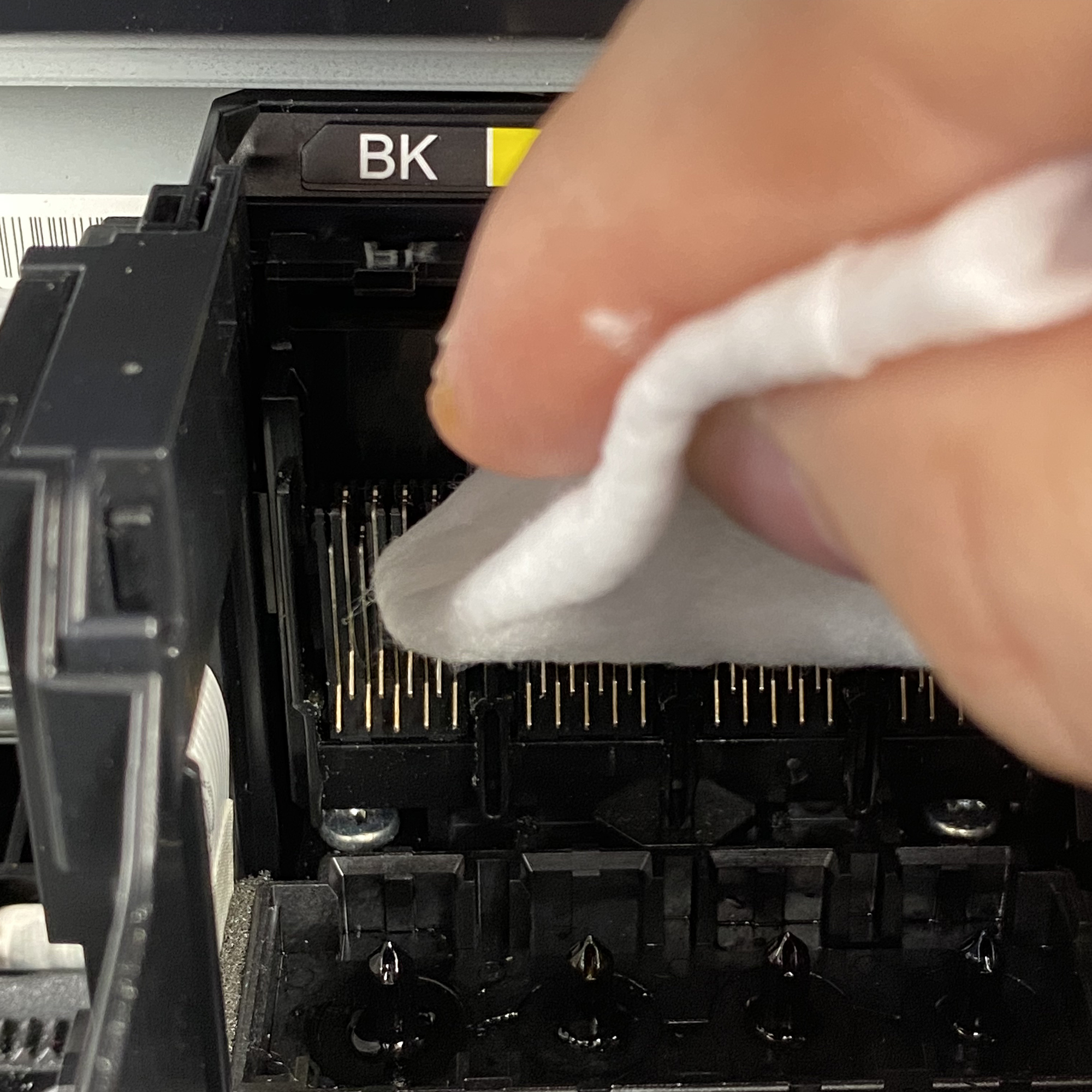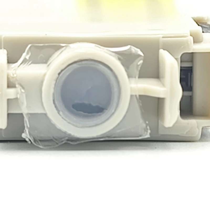 After the cartridge is removed from the printer, you need to make sure that the yellow pull tab covering the cartridge is removed. You also need to make sure that the seal of the printing fluid supply opening on the bottom of the cartridge has been punctured by the printer. (Figure 1)